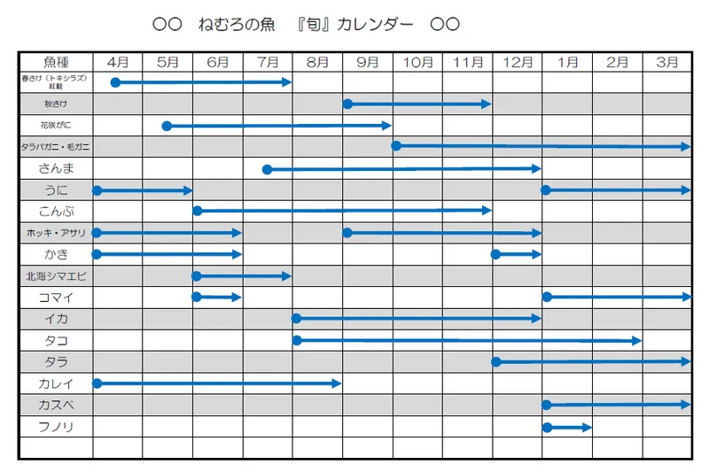 ↑根室市公式サイトからお借りした『ねむろの魚 旬カレンダー』